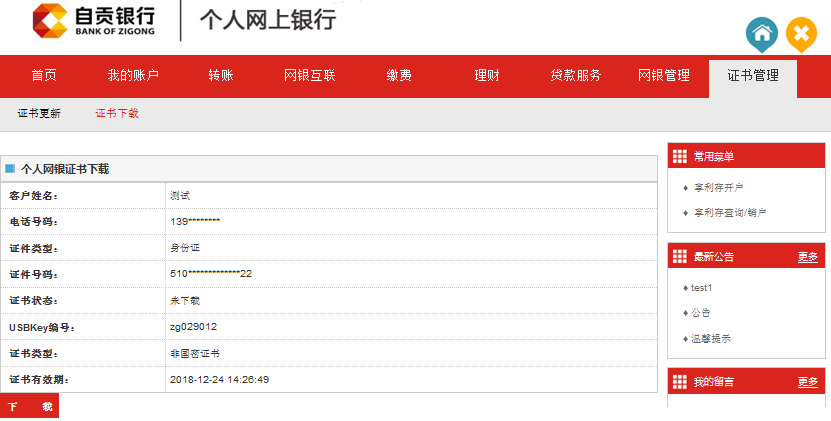 三、网上银行功能特点 1、全新的用户体验 自贡银行新一代网上银行秉持简捷、易用的精神,结合现代、实用等风格要素,为您打造您专属的网上银行服务。 (1)简洁舒适的视觉体验 对布局、色调、风格、字体和字号等进行了调整优化;强调简洁、清新、现代、充满活力又不失沉稳,以传承我行品牌形象,并体现电子银行特征,增强用户视觉美感和舒适度。 (2)个性便捷的操作体验 提供可收展查询方式、多种数据导出方式、 4级标签式菜单、客户端兼容性等功能。 (3)明晰周到的帮助服务 提供菜单命名及操作方式易用、多方位的帮助提示、隔行变色显示、页面编号定位、报错提示优化等功能。 2、更便捷的登录方式 自贡银行网上银行在证书登录(USBKey证书)基础上,新增用户名/账(卡)号方式登录。证书方式登录后,可使用上述所有网银功能,安全快捷;用户名/账(卡)号方式登录后可享受账户查询等服务,即使证书未在身边或未至柜面办理数字证书,也可满足您查询理财等基本需要。 四、使用指南 1、网银登录 网银提供证书登录(USBKey证书),以及用户名/账(卡)号方式登录,证书方式登录后,可使用上述所有网银功能,安全快捷;用户名/账(卡)号方式登录后可享受账户查询等服务,即使证书未在身边或未至柜面办理数字证书,也可满足您查询理财等基本需要。 2、 证书下载 如您至网点柜面办理过证书转换、证书恢复、证书更新等证书类业务,您需要重新下载证书后才可使用网银: 1、 登录自贡银行网站(www.zgbank.com.cn),点击“网上银行”进入个人网银登录页面,登录成功后,点击“证书管理”中的“证书下载”。